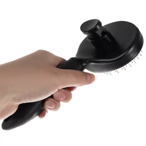 Biztosítsa háziállatának sima és egészséges szőrét ezzel a praktikus fésűvel. Az öntisztító mechanizmusnak köszönhetően a megakadt szőrszálak könnyen eltávolíthatók egy gombnyomással, anélkül, hogy ki kellene húzni őket. Az ergonomikus csúszásmentes fogantyú kényelmes használatot biztosít, míg a fésű finom tüskéi masszírozzák a bőrt, fokozzák a szőr fényét és enyhítik a feszültséget. A fésű univerzális és minden szőr hosszúságához és típusához alkalmas, ideális kutyák, macskák, nyulak és más háziállatok számára.