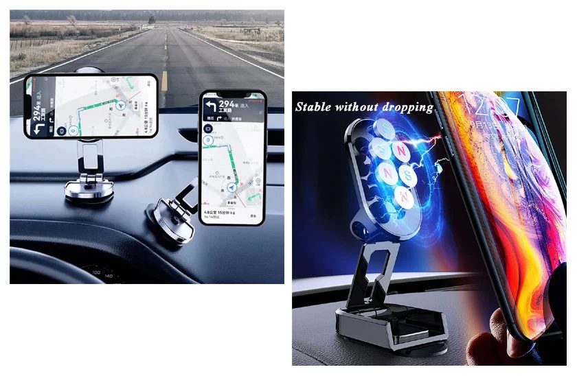 Erős, forgatható mágneses mobiltelefon tartó ideális nem csak az autóba, a fém betéttel ellátott telefonnal csak elég megérinteni a tartót, mivel a mobiltelefon biztonságosan tartja a kívánt helyzetét. Ezenkívül nem zárja el a levegőkimeneteket, mint a szellőzőrácsok tartói, és nagyon kényelmes a felszerelése. A 360°-ban elforgatható, összecsukható mágneses autótelefon tartónak köszönhetően kényelmesen állítható a látószög.