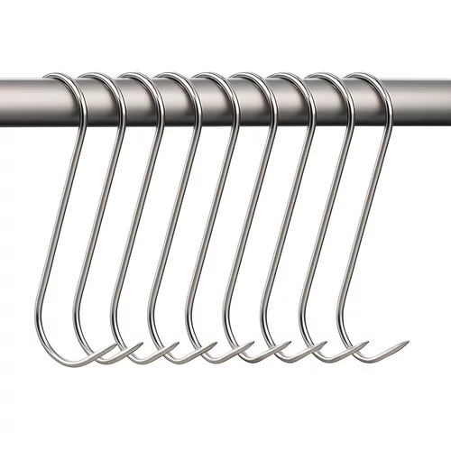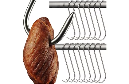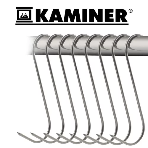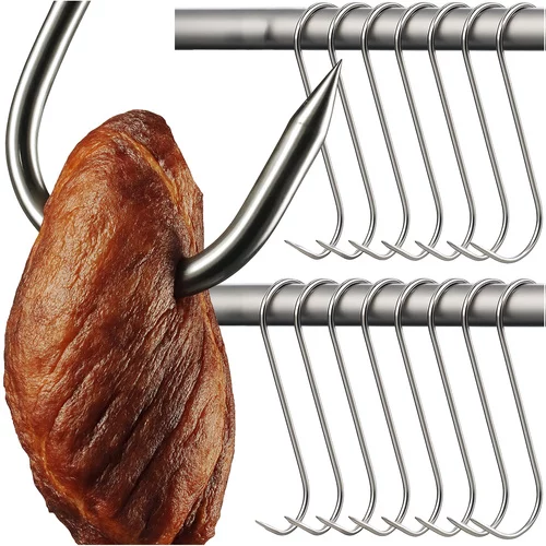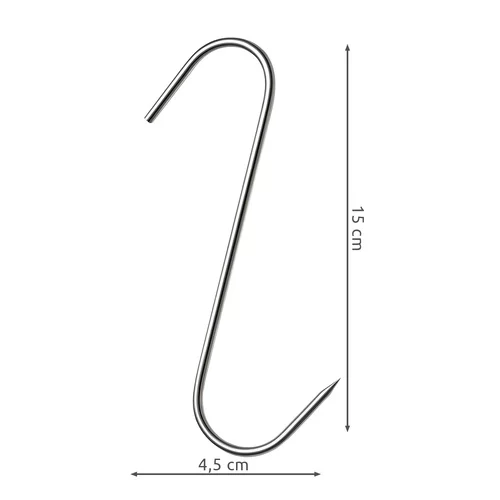 A horogok a legjobb minőségű rozsdamentes acélból készült, ideális hús és hal füstölésére. Rozsdamentes, magas hőmérsékletnek és nedvességnek ellenálló, biztonságos és megbízható felfüggesztést biztosítanak. Hegyes hegy és „S” forma lehetővé teszi a hús könnyű átszúrását és stabil felfüggesztését a füstölő rúdján. Praktikus 15 darabos készletben csomagolva, azonnali használatra kész.
