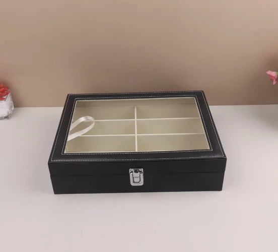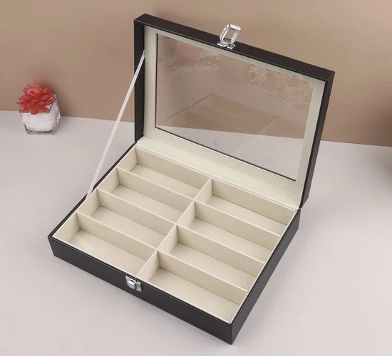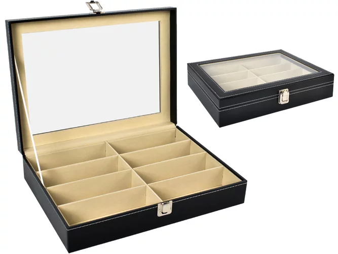 Esztétikus és elegáns – fekete öko bőr fehér varrással és világos kontrasztos belső térrel; az átlátszó fedél lehetővé teszi a szemüvegek tárolását és kiállítását