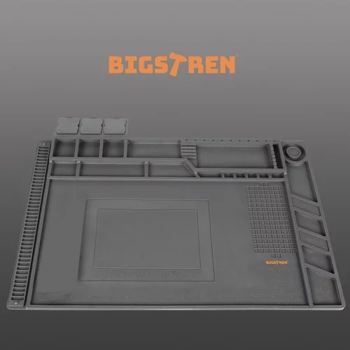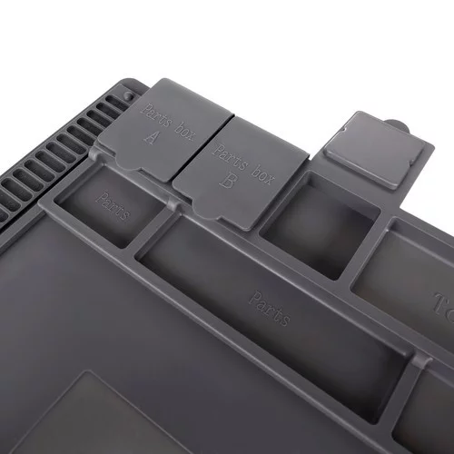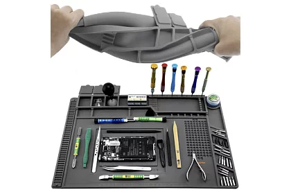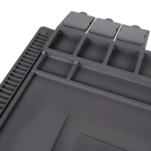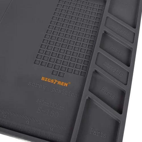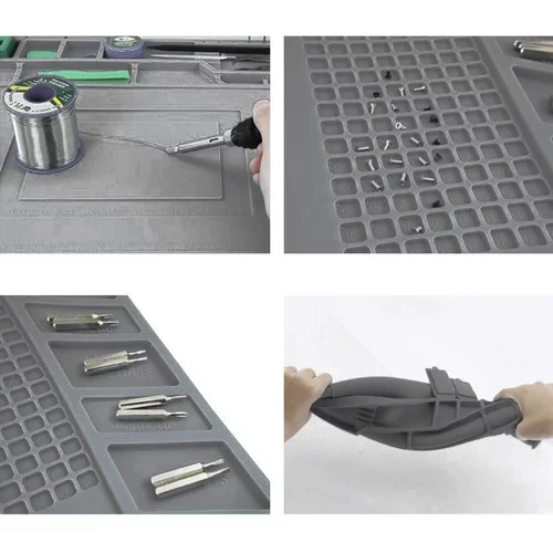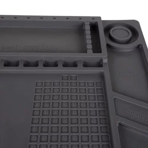 A multifunkciós szilikon alátét ideális minden barkácsoló és szakember számára. A mágneses zsebeknek köszönhetően a legkisebb csavarok és alkatrészek a helyükön maradnak, még akkor is, ha az alátét elmozdul. Az ellenálló anyag biztonságos használatot tesz lehetővé forró szerszámok és vegyszerek mellett. A világos jelölések és a profilozott helyek megkönnyítik a pontos mérést és a szerszámok, valamint a kis alkatrészek rendezését.
