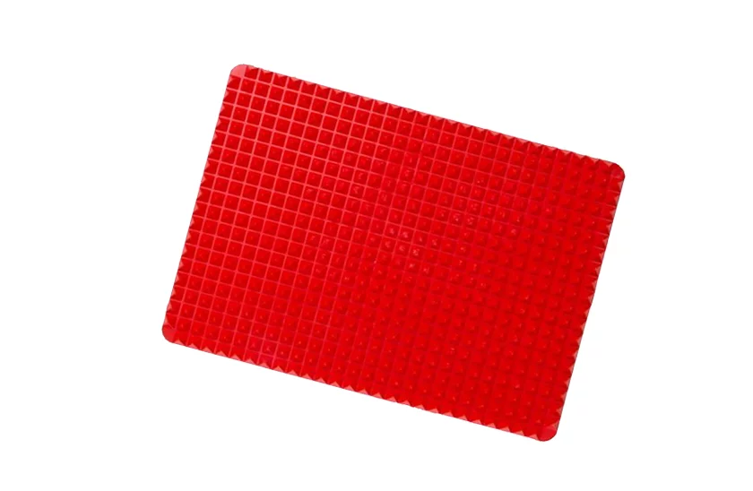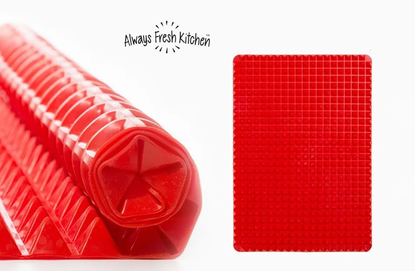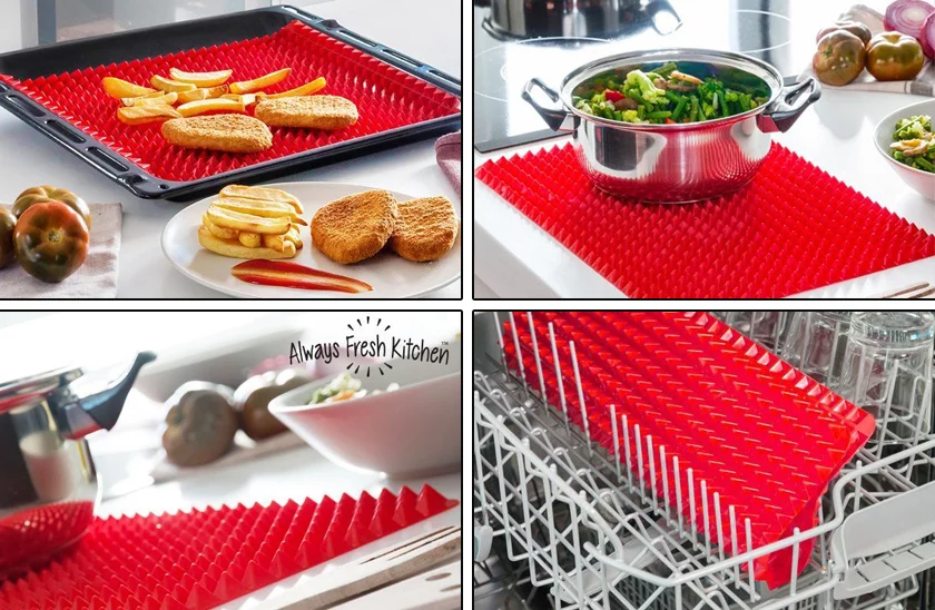 Felejtsd el a sütőpapírt. A szilikon sütőalátét nagyszerű segítő a konyhában. A felületi kidolgozásnak köszönhetően megszabadul a felesleges zsírtól. Mindent, amit elkészít, ropogós és egyenletesen átsütött, ugyanis a piramisok között minden oldalról forró levegő áramlik. Az alátét forró edények alá is alkalmas. Tisztítása kényelmes, csak öblítse le forró vízzel, vagy helyezze mosogatógépbe.