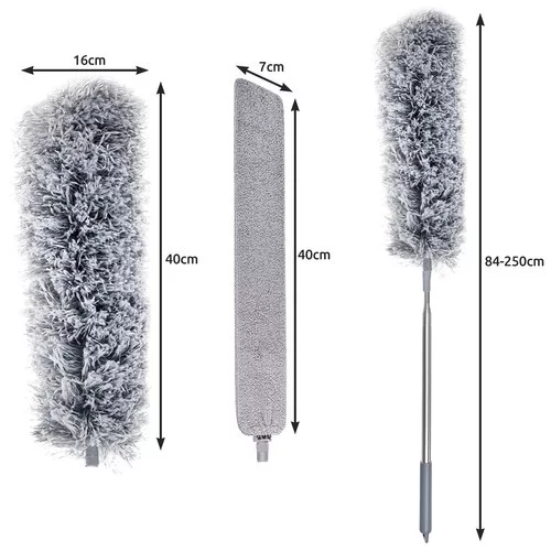 Praktikus teleszkópos mop cserélhető fejekkel megkönnyíti a takarítást a legnehezen elérhető helyeken is. Az állítható teleszkóp 84 cm-től 250 cm-ig kényelmesen elérheti a mennyezetet, a szekrények mögött vagy a bútorok alatt, anélkül, hogy létrára kellene másznia. A készlet tartalmaz egy hosszúkás kefét a sík felületekhez és résekhez, valamint egy kerek kefét a por és a pókhálók alapos eltávolításához. A rugalmas konstrukció lehetővé teszi a kefe hajlítását, így tényleg mindenhová elér.