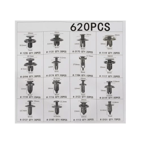 Praktikus és teljes készlet klipszek és kapcsok lehetővé teszi a szilárd és megbízható rögzítést különböző járműalkatrészekhez. Tartalmazza az összes szükséges komponenst a szerelők, barkácsolók és autótulajdonosok számára, akik gyorsan és biztonságosan szeretnék rögzíteni a kárpitot, a burkolatot vagy más járműalkatrészeket. A készlet tartalmaz eszközöket a kapcsok könnyű eltávolításához anélkül, hogy kárt okoznának a járműben.