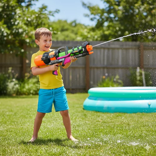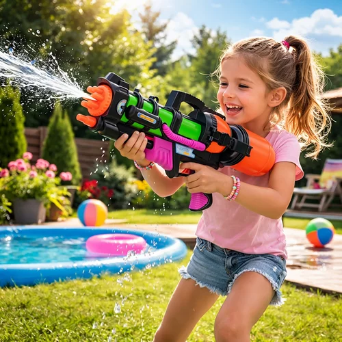 A nyári vízi csaták még szórakoztatóbbak lesznek a 60 cm hosszú nagy vízipisztolynak köszönhetően, amely erős vízsugarat és hosszú hatótávolságot kínál. A nagy 1,25 literes tartály lehetővé teszi a hosszabb játékot anélkül, hogy gyakran kellene vízzel tölteni, így a szórakozás megszakítás nélkül folytatódhat. Az átgondolt csúszó pumpa stabil vízsugarat hoz létre, amelynek hatótávolsága körülbelül 6 méter, lehetővé téve a célzás nagyobb távolságból is.