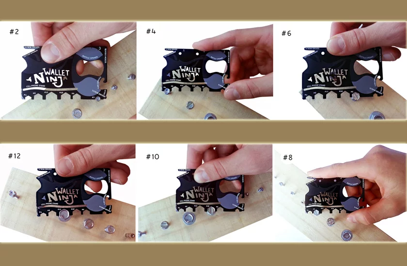 Kiváló eszköz, hitelkártya méretű, amely pontosan illeszkedik a pénztárcába. Wallet Ninja, hasznát veszi, több alkalommal. Ez a csodálatos multifunkciós kártya, soha sem hagyja cserben. A kártyában 18 hasznos eszközök, egyetlen darab acélban.