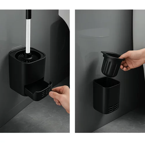 A fekete WC kefe állvánnyal higiéniát és eleganciát ötvöz a fürdőszobában. Hatékonyan tisztítja a nehezen elérhető helyeket, a rendetlenség korlátozott marad a nem felszívó sörték és a praktikus állvány miatt. Fúrás nélküli szerelés lehetővé teszi a gyors rögzítést a falra vagy egyszerű elhelyezést a WC mellett.