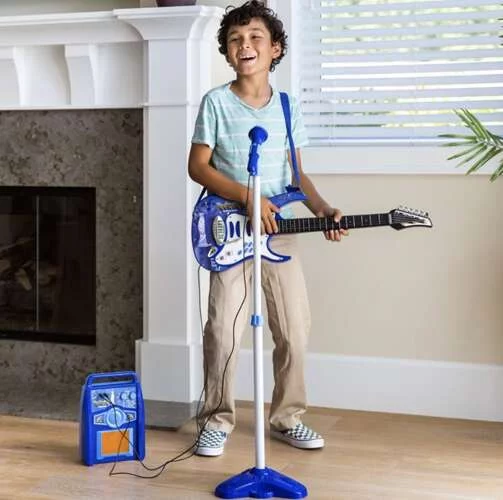 Fantasztikus zenei készlet gyerekeknek, amely ötvözi a gitárt, erősítőt és mikrofont, és minden otthoni szórakozást igazi koncertté varázsol. A MP3 bemenet lehetővé teszi, hogy a gyermek a kedvenc dalokkal játsszon és énekeljen, ami segít leküzdeni a fellépés előtti izgalmat. Villogó fények kísérik a zenét, és show effektust adnak hozzá, míg a be/kikapcsoló gombos mikrofon lehetővé teszi a fellépés irányítását. A készlet elemmel működik, így könnyen szállítható és bárhol használható, anélkül, hogy aggódni kellene az elektromos hálózatra való csatlakozás miatt.