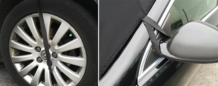 Egyszerű telepítés: rögzítés gumiszalagokkal az ajtókhoz, tükörhöz és kerekekhez; speciális kampók biztosítják a gyors és biztonságos rögzítést.